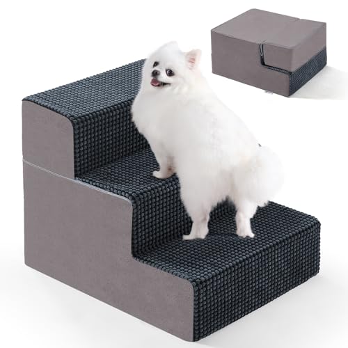Supportive & Steady: These pet stairs for small dogs are crafted with 30D high-density foam and supporting board, providing your pets with enhanced stability. The non-slip corduroy dog step cover increases extra grip even as in use. The bottom features non-slip rubber dots, preventing pets from sliding even as hiking up and down.