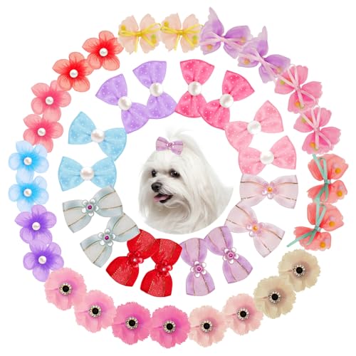 Cute Puppy Hair Leather Bands Set: This dog hair bows set includes 20 pairs (40 pieces) of small dog leather bows in different colors and shapes, with a variety of styles, such as dog pearl hair bands, faux rhinestone dog hair bands, faux pearl dog bows and so on, all of them are very cute and personalized, suitable for small, medium and large dogs, cats and other furry pets, so that your pets are dressed up very beautifully on a daily basis.