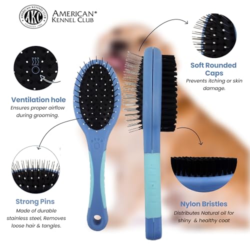 Keep your furry friend looking their best with the American Kennel Club (AKC) 2-in-1 Combo Dog Grooming Brush. This versatile dog brush is designed to cater to all of your pet grooming needs. Featuring dense nylon bristles, this dog grooming brush effectively distributes natural oils, ensuring a shiny and healthy coat. The coated pins are perfect for removing loose hair and reducing shedding, making it an excellent deshedding tool. Ideal for all breeds and coat types, this pet grooming brush gently detangles knots and mats, providing a comfortable grooming experience for your dog. The ergonomic deal with offers a firm grip, making it easy to use throughout grooming sessions. Regular use of this dog hair brush promotes healthy skin and stimulates blood circulation, contributing to the overall well-being of your pet. Trusted by pet owners and endorsed by the American Kennel Club (AKC), this dog coat brush is a reliable choice for both professional groomers and pet owners. Whether your dog has short hair or long hair, this dog bristle brush and pin brush combination will keep their coat looking its best. Say goodbye to excess shedding and tangled fur with the AKC 2-in-1 Combo Dog Grooming Brush – the ultimate grooming tool for dogs.