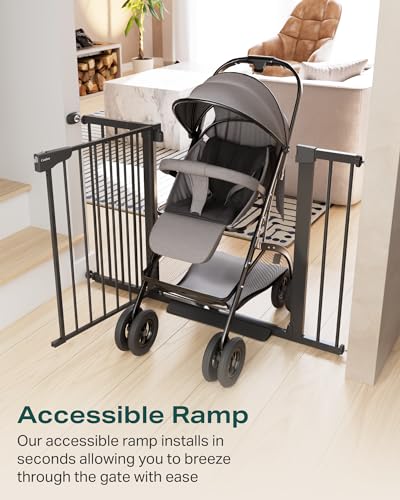 【Durable design】The steel design of the baby gate can face up to impacts up to 150 pounds from dogs like Huskies or Alaskans without budging! You do not wish to worry about the gate being pushed down and hurting your children. Great for families with both children and pets!