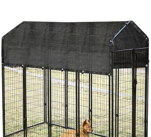 【PREMIUM MATERIAL】This lightweight and durability dog kennel cover is made of high density polyethylene (HDPE), Anti-aging, Resists tearing and fraying. The four corners are reinforced by grommets, which is able to beef up the endurance of pulling 【BREATHABLE】Breathable material and mesh tarp structure design. Keep the air fresh and make allowance hot air to be pushed out. Shade 90% of sun, can significantly reduce the temperature of the covered area. Your pet can enjoy a cool time within the kennel with our shade cloth even within the hot summer