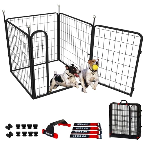 UPGRADED WIDER DOORS with STAINLESS STEEL BALL:IGOOUO dog metal playpen is designed with a widening gate for you to get in and out of the igoouo dog playpen more conveniently ,the balls on the stakes are made of stainless steel,rust-proof and suitable for outdoor use,the wire spacing is 1.57”,it’s suitable for small medium dogs/animals.