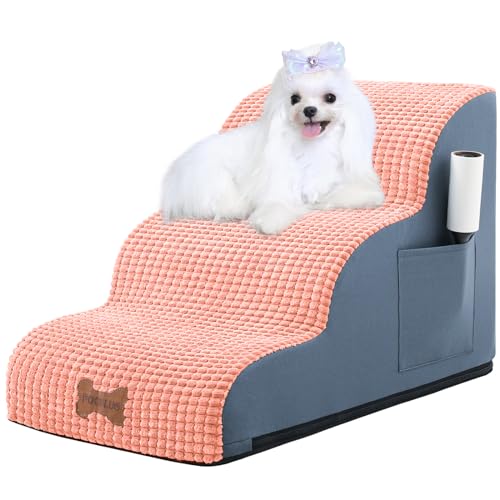 POCBLUE Dog Stairs for Small Dogs, Pet Stairs for High Bed and Couch, Dog Ramp for Dogs and Cats, Non-Slip Pet Steps with Highly Supportive Foam, Low Ramp and Larger Step Area No Assembly, 3 Tiers Pink