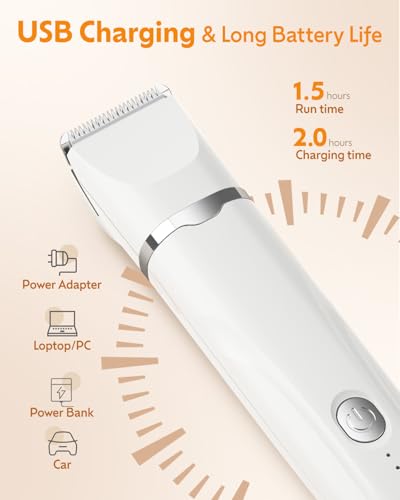 ✔Ergonomic Design Hair Clippers Kit for Dogs: 🐶🐱Our Cordless dog trimmer is light weight, Rechargeable electric hair clippers for dogs with built-in battery make it flexible for you, Which lets you trim your pet anytime, anywhere. You should not have to worry about tangled wires. This wireless hair clippers for dogs can be utilized for 1.5 hours after being re-charged for 2 hours. USB charging cable is provided, not the power adapter.