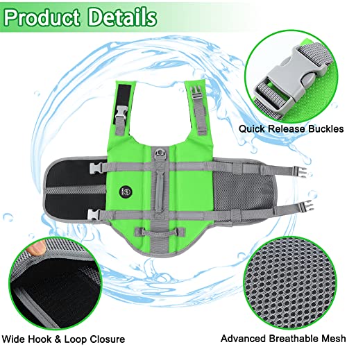 Perfect Pratical Design: The dog life preserver is designed with adjustable belt and quick-release buckles to make your dog fit comfortably, easy to put on and take off. Care for on top for quick and easy grabbing. The Heavy-duty D-ring Hook is perfect for dog leash. Reflective stripes and bright colors to improve maximum visibility.
