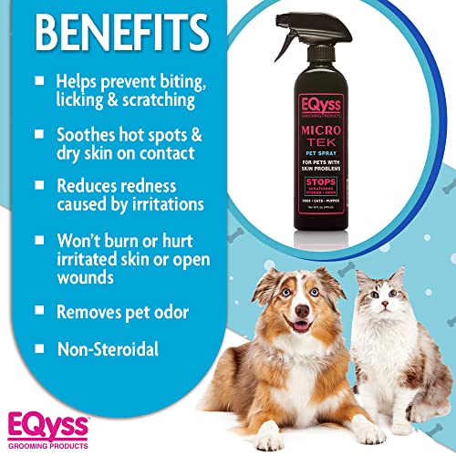 Soothe Dry, Irritated Skin Fast: EQyss Micro-Tek Pet Spray is fast-acting to assist your dog, cat, puppy, or kitten stop scratching, itching, biting, or licking hot spots in as low as 1 application! The easy-to-use spray is non-caustic and won’t burn or hurt open wounds.