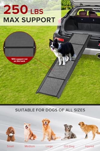 Wide Application Protected and Steady Pet Ramp: aluminum frame makes it tough and steady, ensures safety to your pets. It may be widely used in cars, trucks,SUVs, and in addition high beds, couch, and porch stairs. Not only be loved by small medium and large dogs, but also other pets like small or old cats.