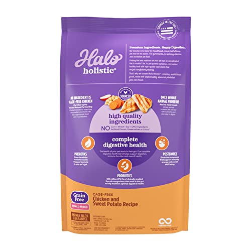 3.5lb bag of Halo Holistic Grain-Free Cage-free Hen and Candy Potato Recipe dry small breed pet food: Hen pet food made with actual, complete rooster as the principle ingredient and no meat meals of any sort.