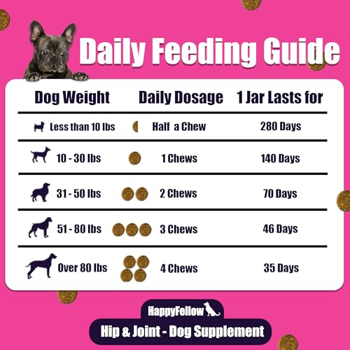 SIZING DURABILITY: Tailored for dogs of all weights, our HappyFellow Dog Hip and Joint comes with 140 soft chews. Serving is easy with our guide: less than 10 lbs = 0.5 chew, 10-30 lbs = 1 chew, 31-50 lbs = 2 chews, 51-80 lbs = 3 chews, and over 80 lbs = 4 chews. This ensures your dog gets the right reinforce for their size, every time.