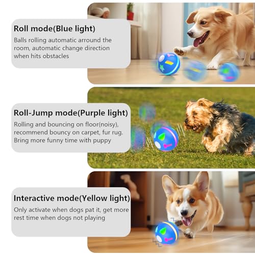 Electric peppy pet ball with motor. THREE modes to be had – Rolls mode, Roll-Jump mode, Interactive mode. Jumping actication interactive dog ball works great on carpet, but cause noisy if bouncing on wooden floor