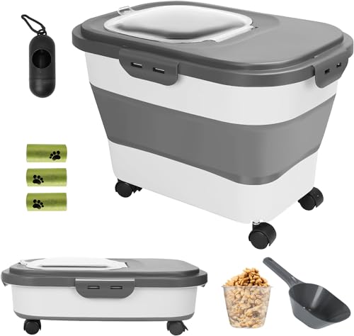 Tgvasz Pet Food Storage Containers 20-23 Lbs Collapsible Dog Food Storage Container – with Measuring Cup &Scoop,Dog Poop Bags With Dispenser Dog Food Bin to Keep Dry Food Fresh, Easy to Move( Dark Gray)