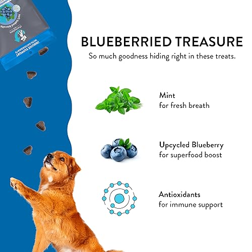 Whole Ingredients: These craveable treats are free from grain, corn, and soy even as still loaded with wholesome ingredients like real blueberry and mint. Dogs of every age, sizes, and breeds can enjoy!