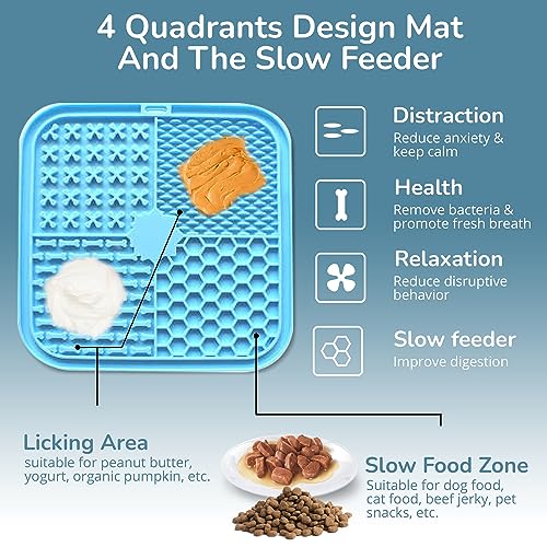Includes a Slow Feeder and a Lick Mat. Both Assist with Mental Stimulation, Anxiety. The easiest combination for eating , and for snacks. Use lick mat for Mental Stimulation all the way through the day , and for meals continue the fun with our slow eater.