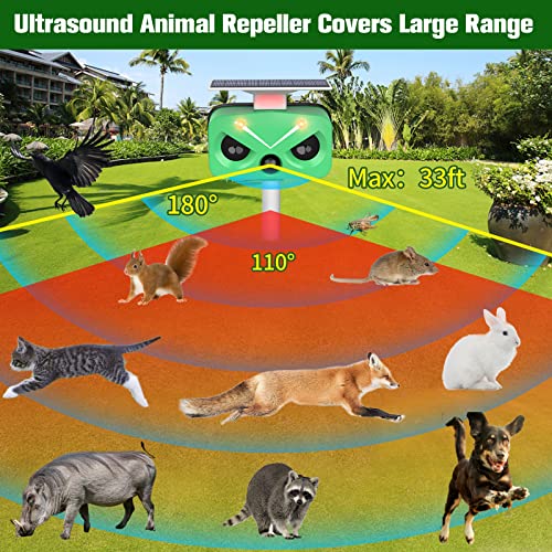 🏆【Upgraded Ultrasonic Animal Repeller】This 2024 New ultrasonic animal repellent has the most advanced ultrasound technology, with a view to produce strong ultrasonic waves,and it is accompanied by alarm sound and LED Flashes, making unpopular animals to stay away from your manor. With a built-in high-sensitivity PIR motion detection sensor,the ultrasonic cat deterrent outdoor will detect pests and activate the ultrasonic system to trigger at an angle of 110°,and the maximum range can reach 33 feet.