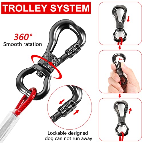 360° TANGLE FREE: The clips of the dog trolley and dog running cable are made of prime quality zinc alloy, ultra-light weight, so that your pet will not feel tied up. 360° rotating latch design can effectively avoid bushes or other obstacles on the ground, allowing your dog to run safely and happily without tangles.
