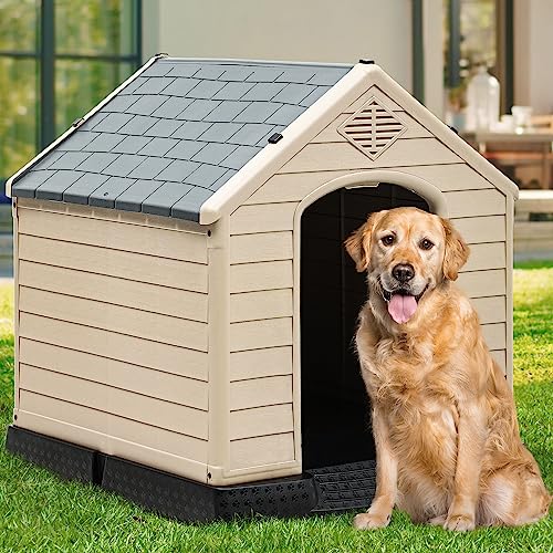 SMALL & MEDIUM SIZED DOG HOUSE- This plastic dog house features overall dimensions of 41”L*38”W*39”H and a door sized 14.6”*24.4”, providing a spacious room for pets and dogs such as Pomeranian, French Bulldog, Teddy, etc.
